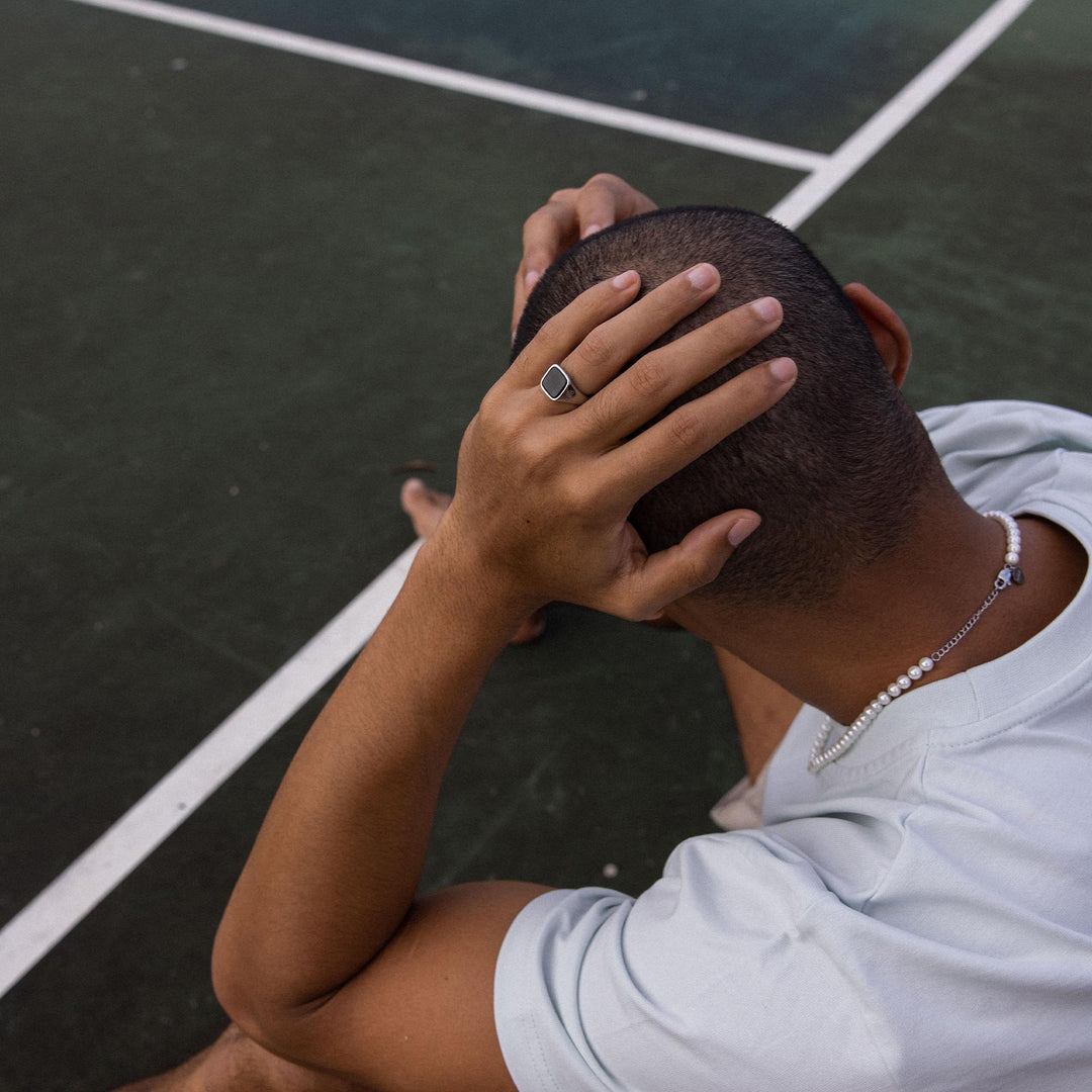 Aurora Flame is a striking men's signet ring featuring a bold square of natural black onyx. Crafted from durable stainless steel, this ring balances refined elegance with everyday strength. The polished silver band contrasts perfectly with the deep black stone, creating a sleek and powerful look. Lightweight and comfortable, it’s perfect for daily wear, formal occasions, or as a bold alternative for engagements and weddings.