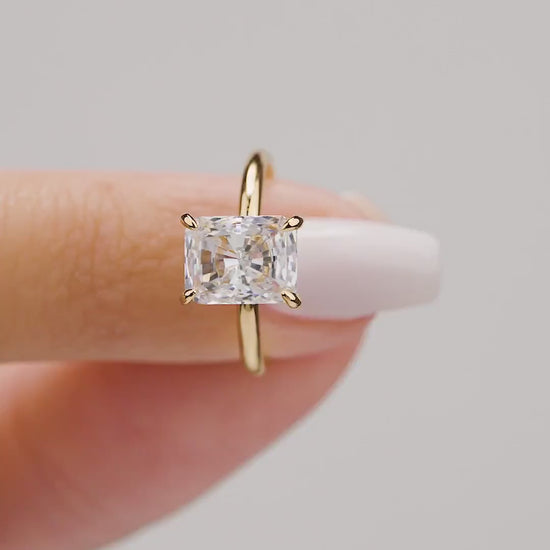 The embodiment of elegance and beauty is none other than The Camille - gold. This 3 carat radiant cut solitaire engagement ring has a sleek band and hidden halo detail beneath the stone captures the light perfectly to leave your ring sparkling from every angle.
