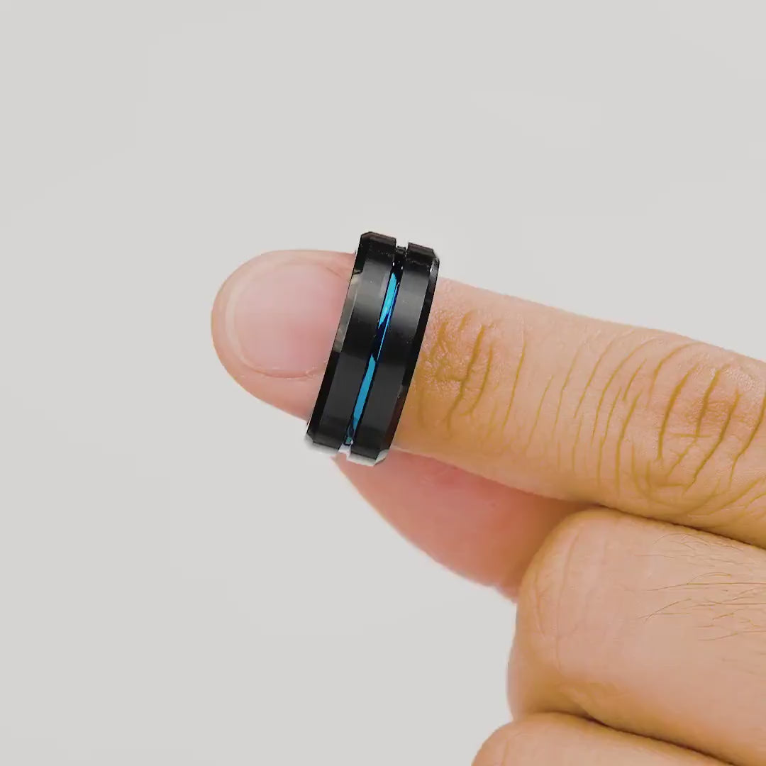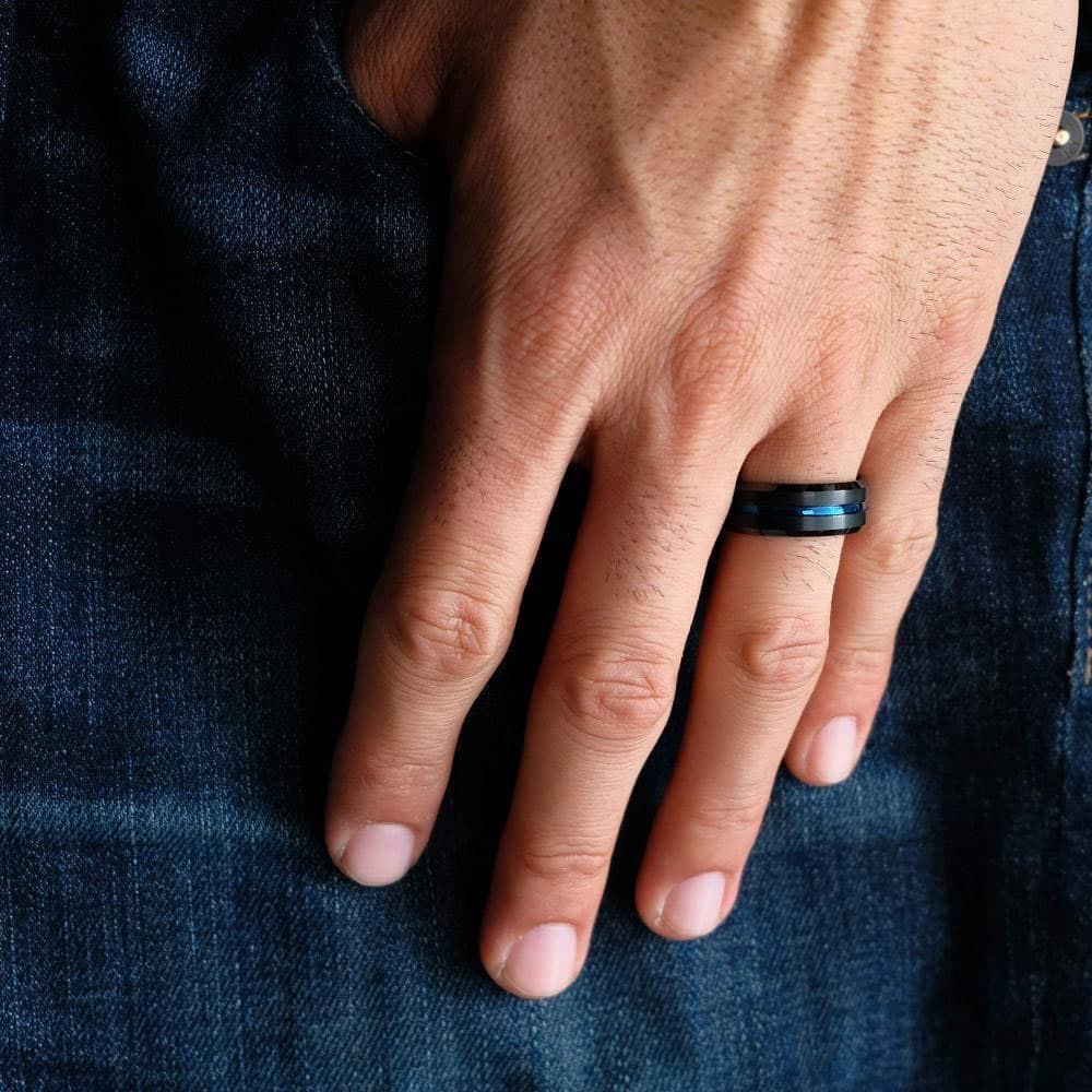 The Commander black and blue tungsten ring is ideal for those who are married, engaged or just want a high-quality ring in their collection.