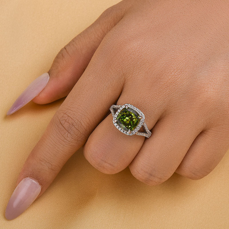 Our rings are all handmade and crafted to perfection with a gorgeous alternative to a mined diamond. You’ll get all of the brilliance of a perfect and colourful gemstone without having to spend a fortune. This elegant piece features a 3.5 carat cushion-cut simulated diamond in a rich, vibrant green that instantly catches the eye. Sparkling white round-cut side stones add a luxurious touch of contrast and brilliance.