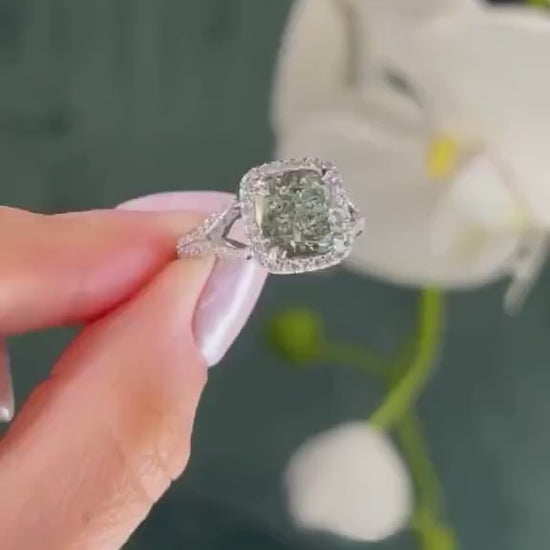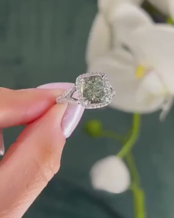 Meet an elegant masterpiece featuring a vibrant 3.5 carat cushion-cut simulated diamond in the most mesmerizing shade of green. Framed by sparkling round-cut white side stones and set in luxurious 925 sterling silver with 18K white gold plating, this ring is pure radiance from every angle. Whether it’s a special event or just an everyday moment you want to elevate, brings timeless charm with a modern twist.