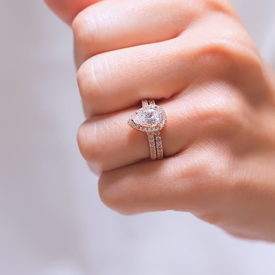 There’s something about the way a pear cut stone catches the light and Eternal Drop - Rose Gold wedding set does it oh so beautifully! Featuring a 2 carat pear cut center stone surrounded by a dazzling halo and half eternity band detailing, let’s just say the sparkle is REAL. No wedding ring set is complete without a band and this one includes a stunning and versatile half eternity band that sits flush with its engagement ring.