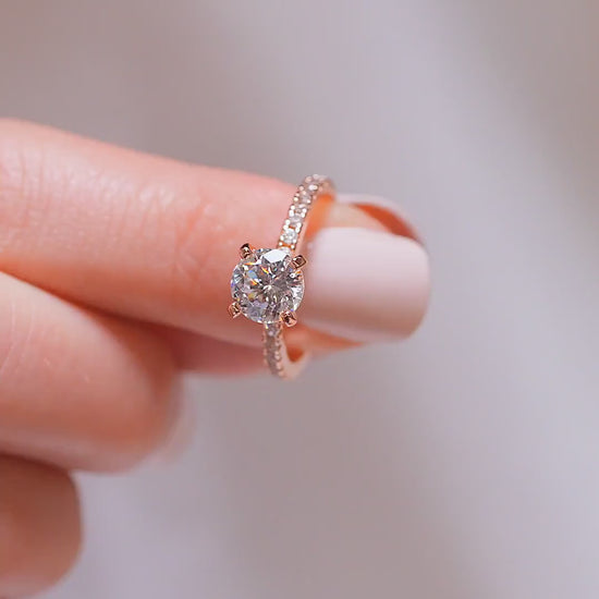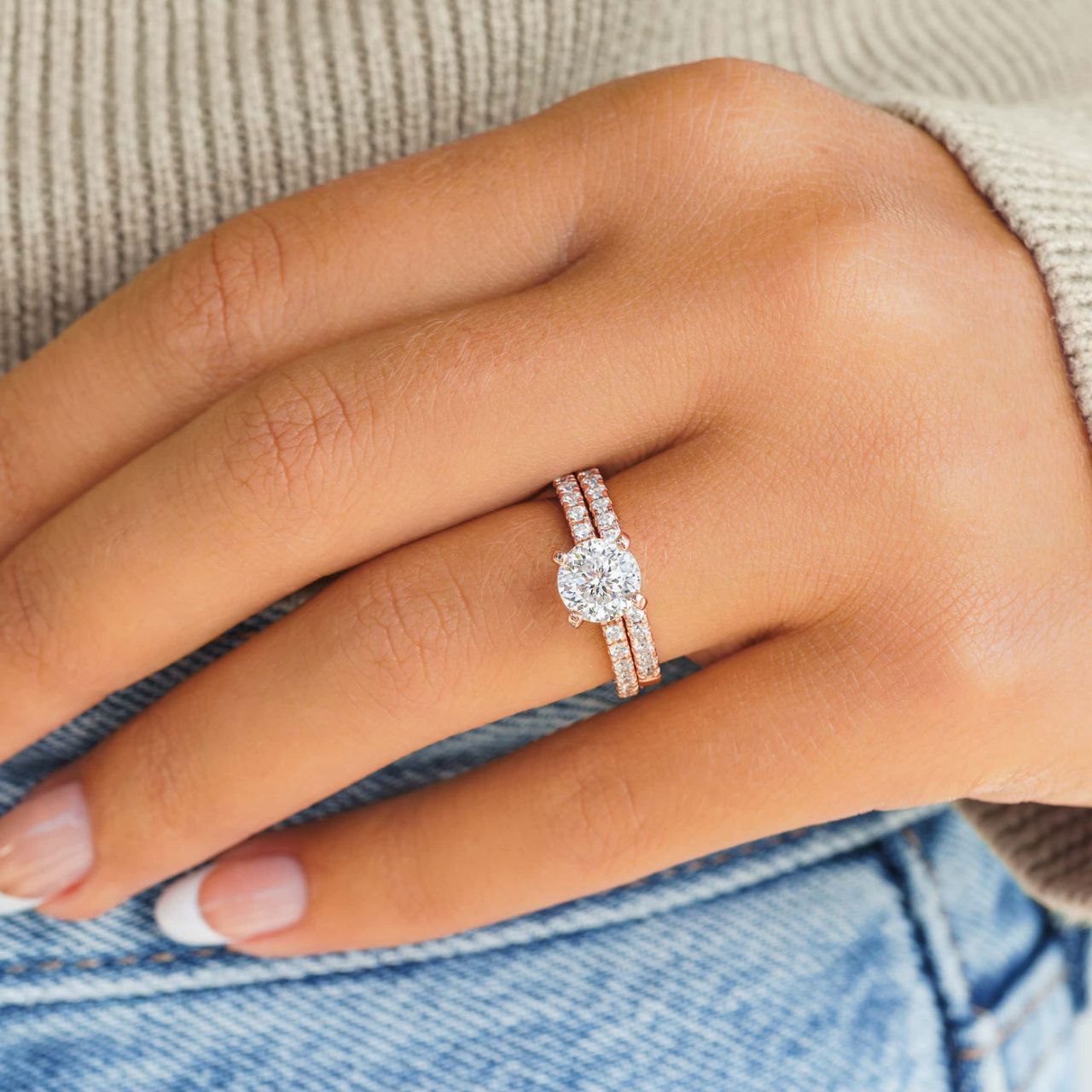 Just like a summertime starry night, she won’t be able to take her eyes off of this beautiful rose gold engagement ring set. Eternal Spark features a radiant engagement ring with a bright and shimmering 1.75 carat round cut conflict free simulated diamond center stone. Paired with a gorgeous set of stones on the sides of the engagement ring and wedding band, this timeless 925 sterling solitaire bridal set will light her sky for an eternity!