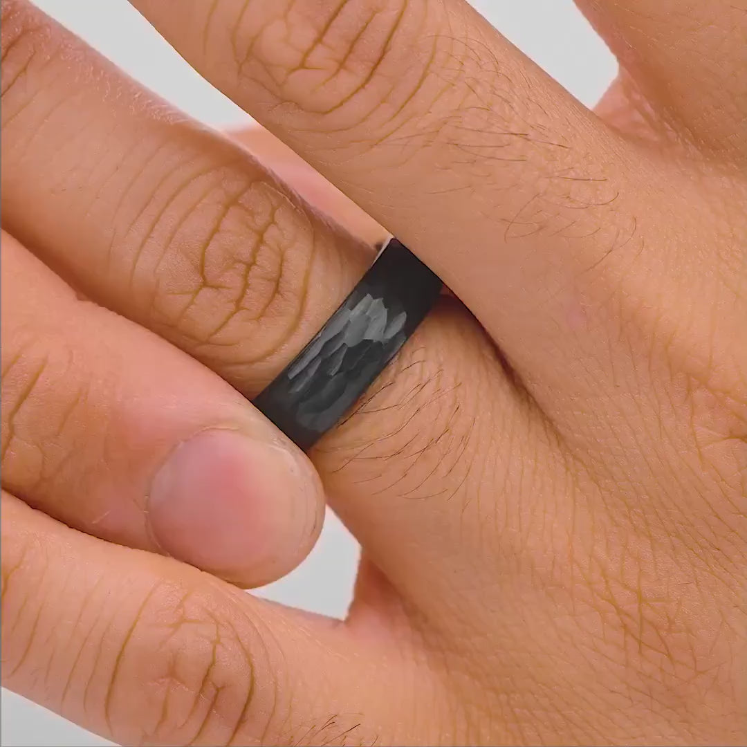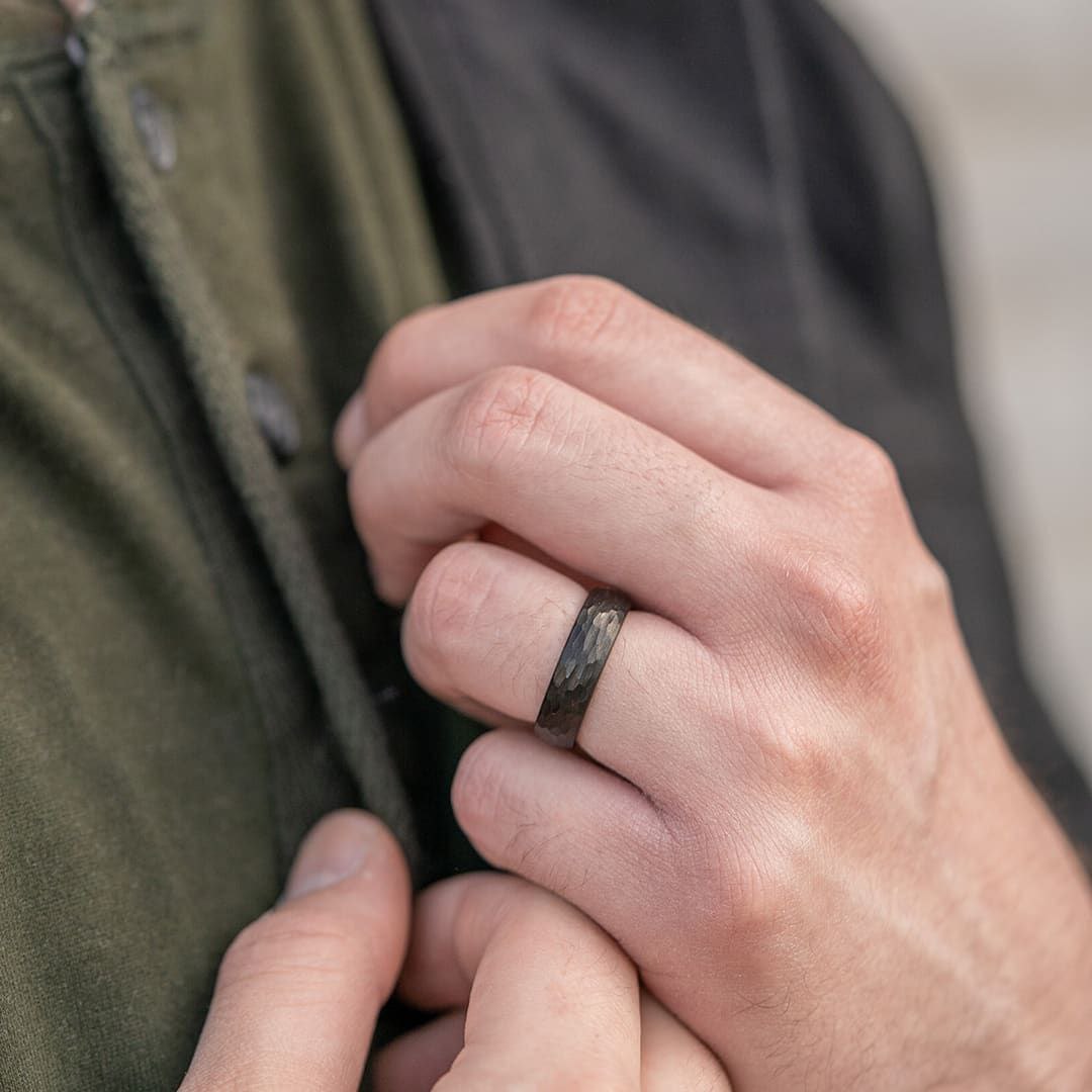 Looking for a super rad black wedding band that doesn’t scream “basic”? Meet the Hammer. This unique hammered designed ring is made of ultra-durable tungsten carbide and is finished in a deep black finish. You’ll love how sleek, yet rugged the black finish looks on your hand.