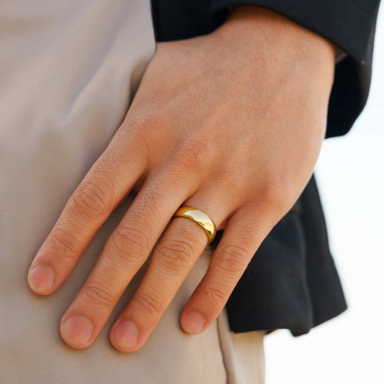 There’s nothing quite like the reflective shine of a golden glowing wedding ring. The Horizon is a unisex band that takes tradition to the next level with a minimalist yet striking design that’s perfect for every style. Crafted from stainless steel with a wide diameter and a vibrant gold finish, The Horizon brings you a wedding band that is both bold and timeless. Its sleek and gender neutral design ensures it fits seamlessly into any wardrobe, whether you’re dressing it up or keeping it casual. As a wedding band or daily accessory, this ring is all about making a statement—without saying a word.