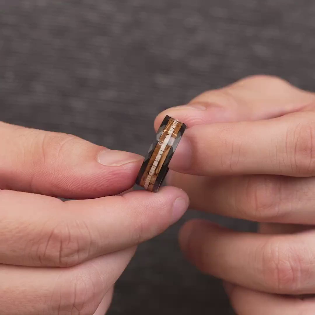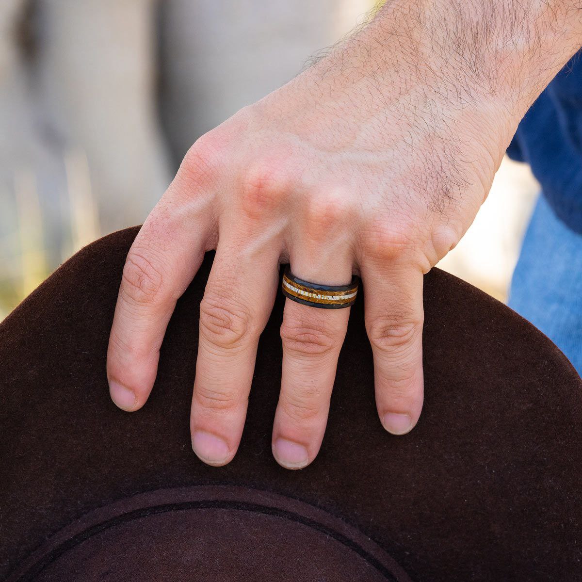 Get ready to rock this ring while you’re out hunting or at the shooting range. The Scout shows off a fresh look with an antler inlay and hammered black exterior. This ring can withstand pressure while you’re chucking an axe or chugging a beer.