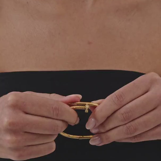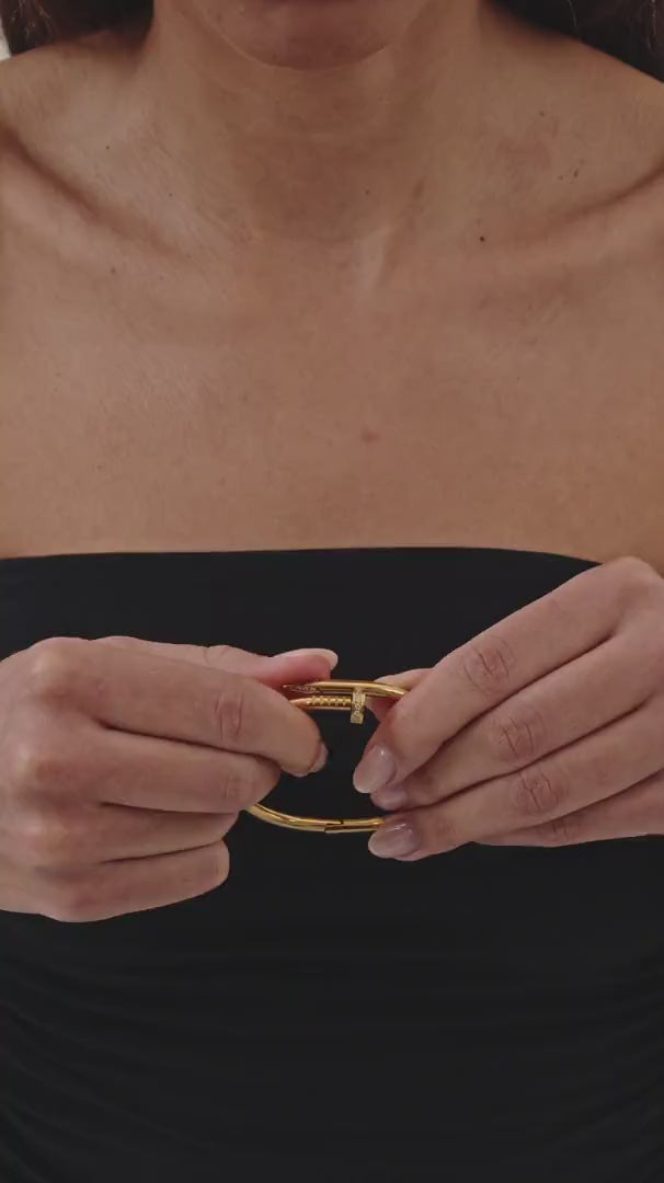 Edgy, sleek, and timeless — this bracelet is designed to stand out. Crafted in a stunning gold finish, its unique nail-inspired design adds just the right amount of edge to any outfit. Wear it solo for a striking statement or stack it with other favorites to create your own signature look.