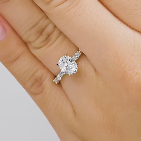 This engagement ring gives a feeling of pure elegance. Twilight Kiss seamlessly combines a stunning 1.5 carat oval cut center stone with a uniquely designed half eternity band in a gold finish that will shine for eternity. The band is carefully crafted with small, delicately placed stones on both sides and looks absolutely breathtaking. Also available in silver.