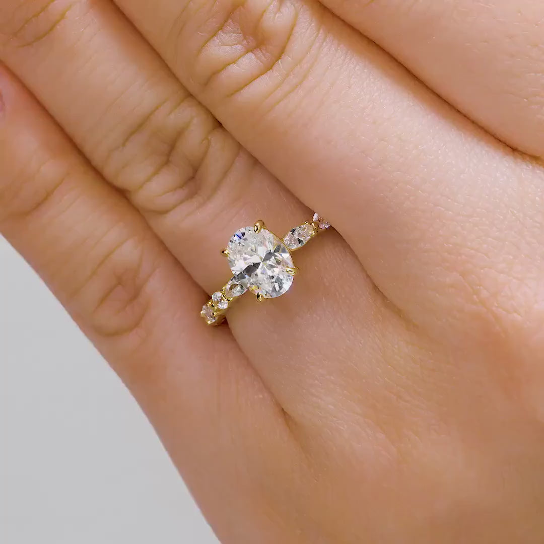 This engagement ring gives a feeling of pure elegance. Twilight Kiss -Gold seamlessly combines a stunning 1.5 carat oval cut center stone with a uniquely designed half eternity band in a gold finish that will shine for eternity.